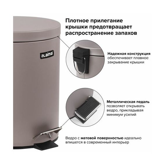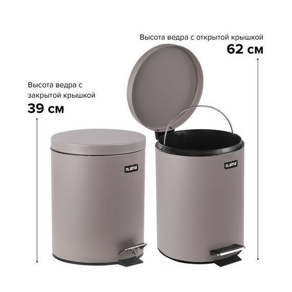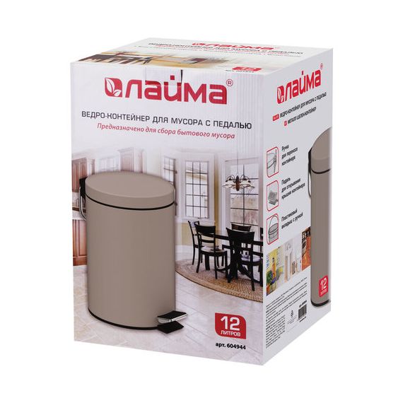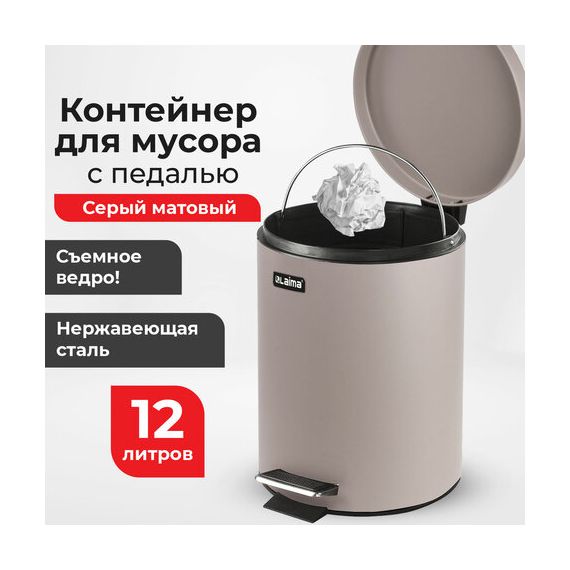 Ведро мусорное с педалью 12 литров "Classic", СЕРОЕ МАТОВОЕ, металлическое, со съемным внутренним ведром, LAIMA, 604944