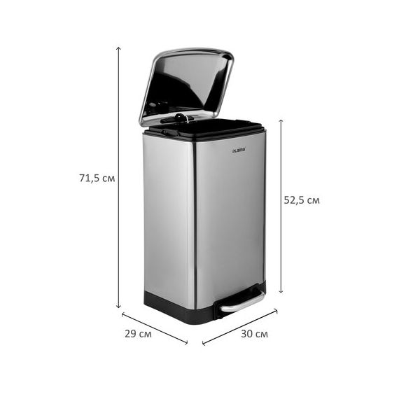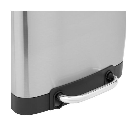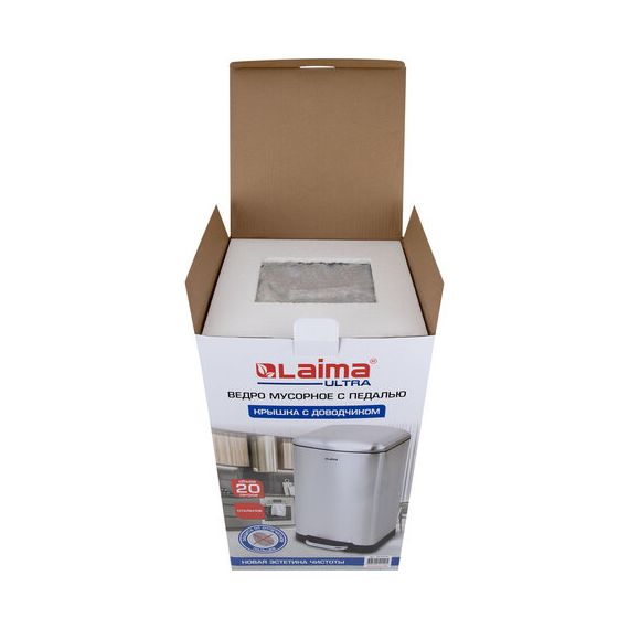 Корпус и крышка ведра изготовлены из матовой нержавеющей стали SS410, на которой не остаются отпечатки пальцев. Ведро устойчиво благодаря антискользящим вставкам. Оборудовано удобной педалью для открывания, позволяя вам выбрасывать мусор, не прикасаясь к ведру. Благодаря встроенному доводчику крышка закрывается плавно и бесшумно. Крышка плотно прилегает к ведру, препятствуя распространению запахов. Внутреннее съемное пластиковое ведро на 20 л имеет специальное отверстие на задней стенке для фиксации мусорного пакета.
