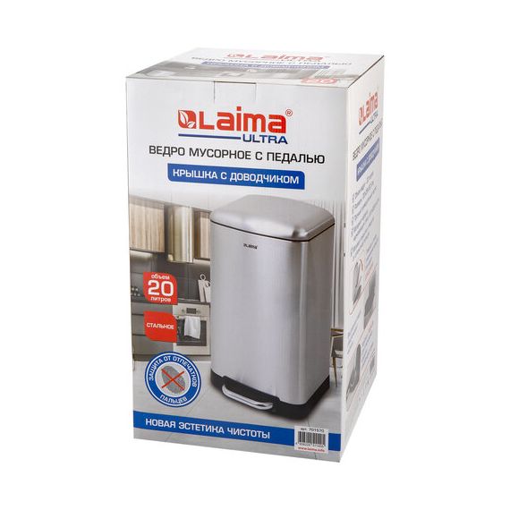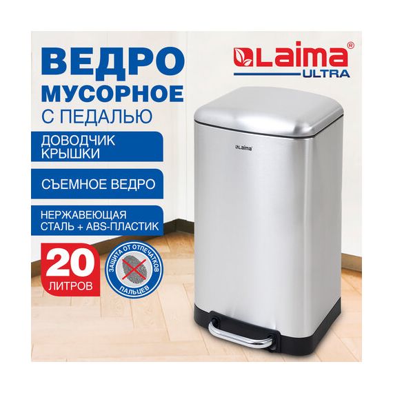 Ведро мусорное с педалью 20 л, крышка с доводчиком, стальное, БЕЗ ОТПЕЧАТКОВ, LAIMA ULTRA, 701570