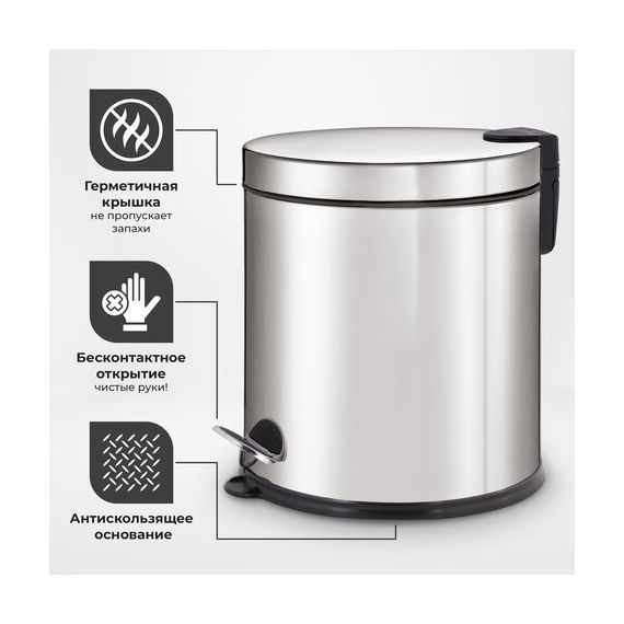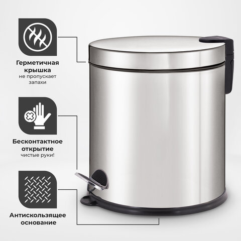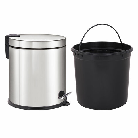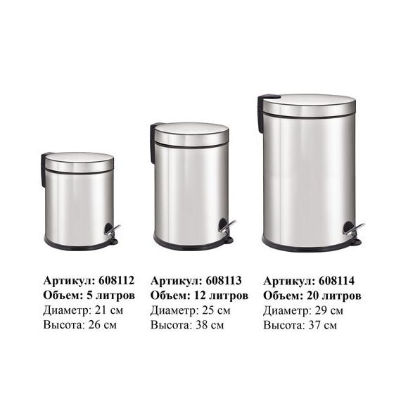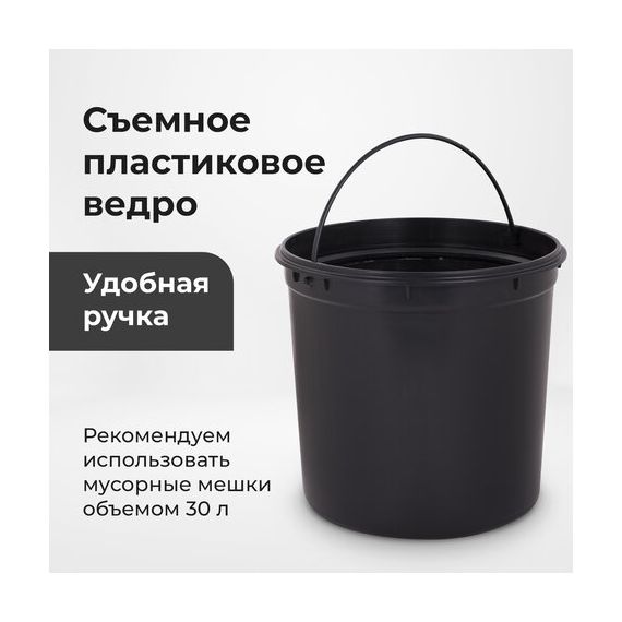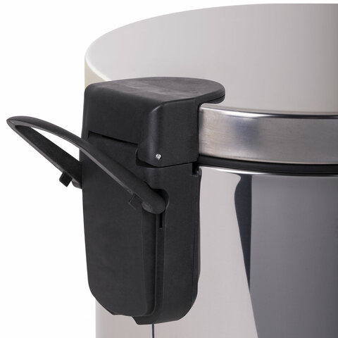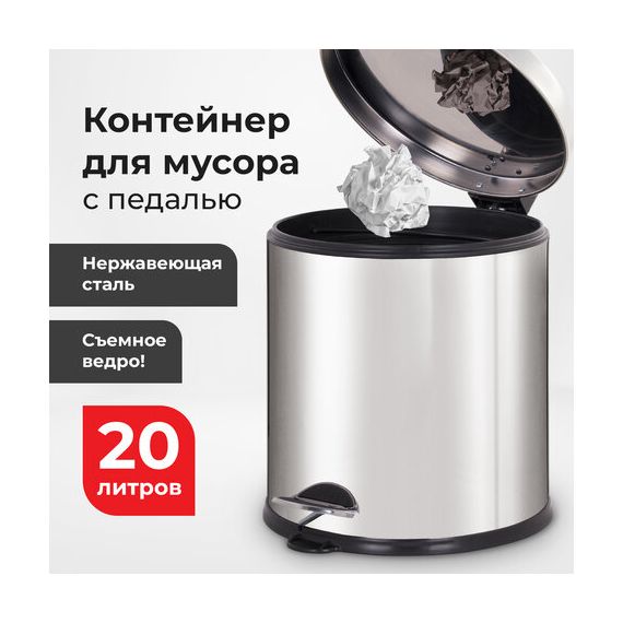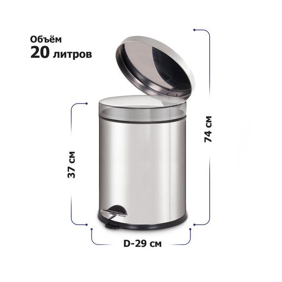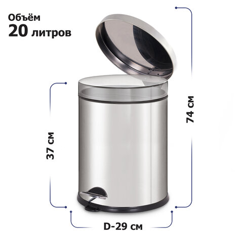20 л – подходящий объем при большой проходимости. Оборудовано педалью для открывания. Крышка плотно прилегает, предотвращая распространение запахов. Внутреннее съемное пластиковое ведро имеет удобную ручку для извлечения.