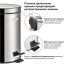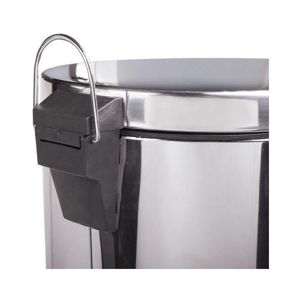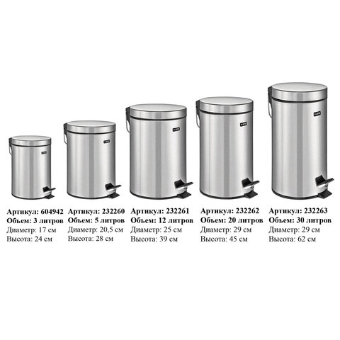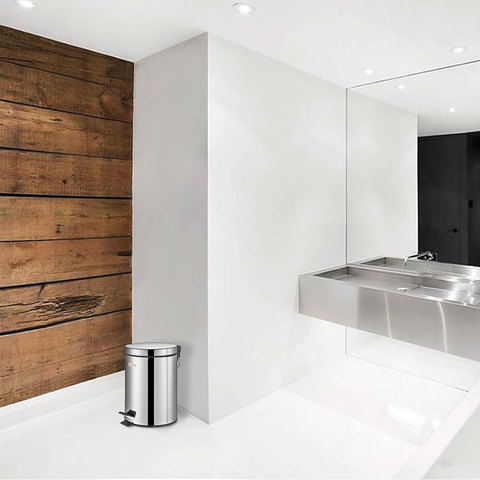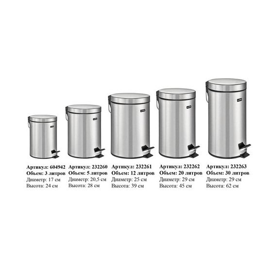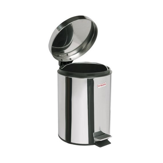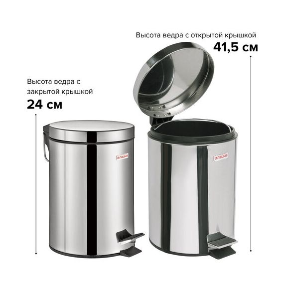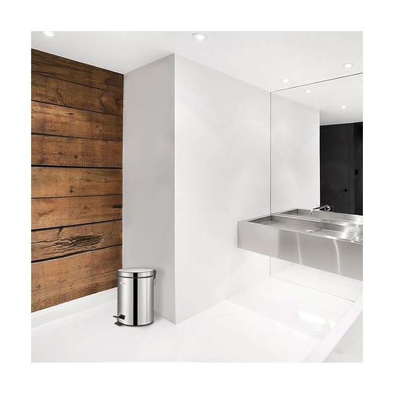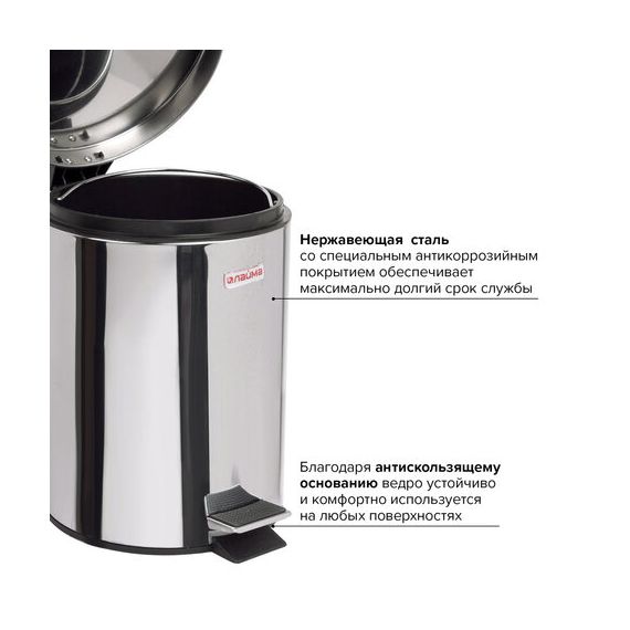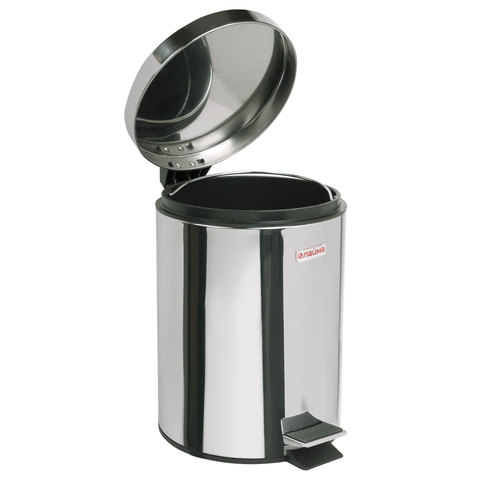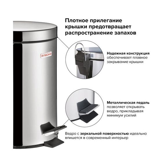 3 л - подходящий объем при малой проходимости. Оборудовано педалью для открывания. Крышка плотно прилегает, тем самым препятствуя распространению запахов. Внутреннее съемное пластиковое ведро имеет удобную рукоятку для извлечения. Изготовлено из нержавеющей стали со специальным антикоррозийным покрытием, что обеспечивает максимально долгий срок службы. Ведро устойчиво благодаря антискользящему основанию. Объем рекомендуемого мешка - 12 л. Контейнер для мусора в стальном цвете с зеркальным покрытием имеет компактные размеры (24х17х17 см) и отлично впишется в любой интерьер.
