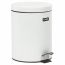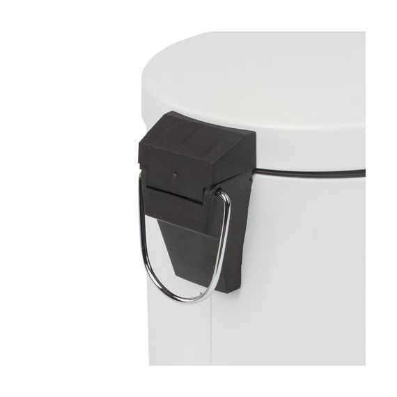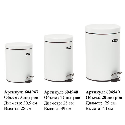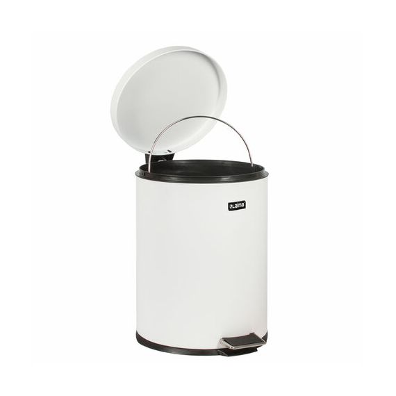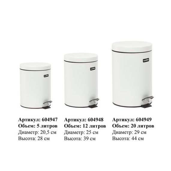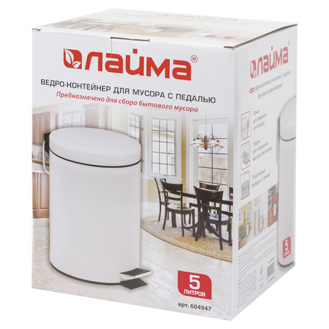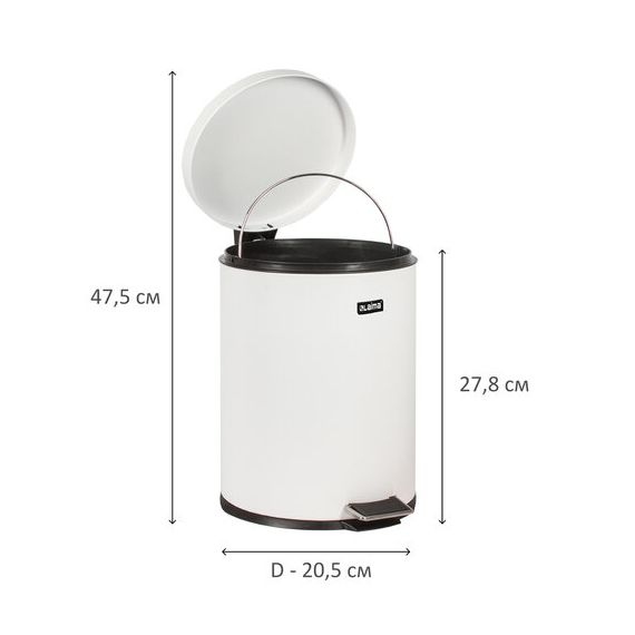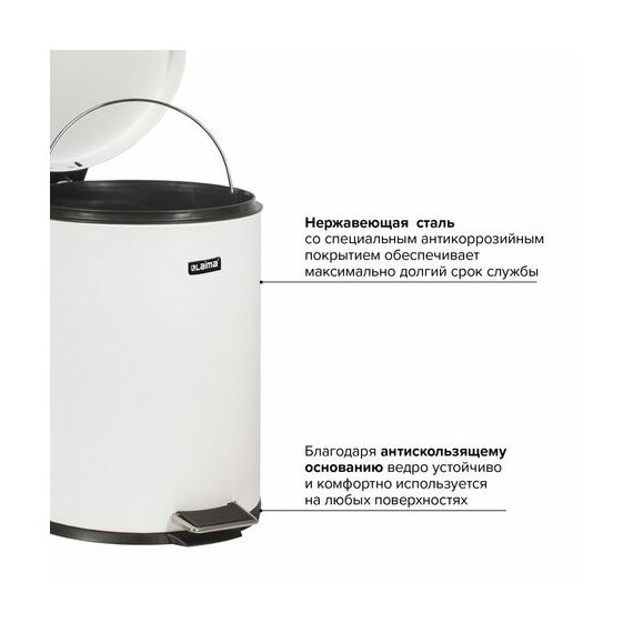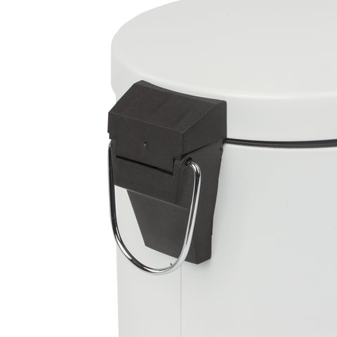 5 л – подходящий объем при небольшой проходимости. Оборудовано педалью для открывания. Крышка плотно прилегает, тем самым препятствуя распространению запахов. Внутреннее съемное пластиковое ведро имеет удобную рукоятку для извлечения. Изготовлено из нержавеющей стали со специальным антикоррозийным покрытием, что обеспечивает максимально долгий срок службы. Ведро устойчиво благодаря антискользящему основанию. Объем рекомендуемого мешка – 10 л. Контейнер для мусора в белом цвете с глянцевым покрытием имеет компактные размеры (28х20,5х20,5 см) и отлично впишется в любой интерьер.