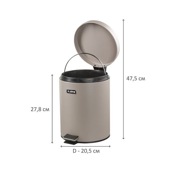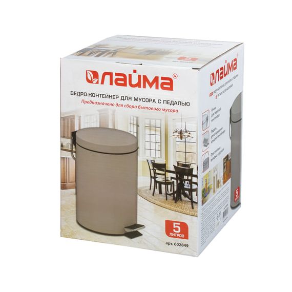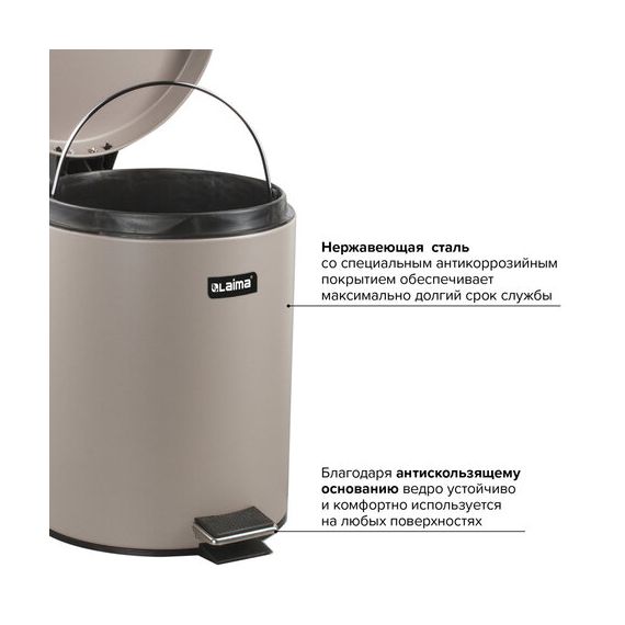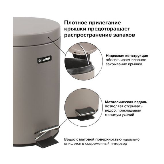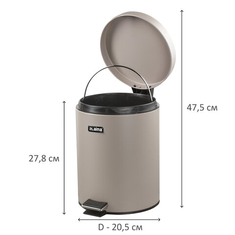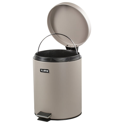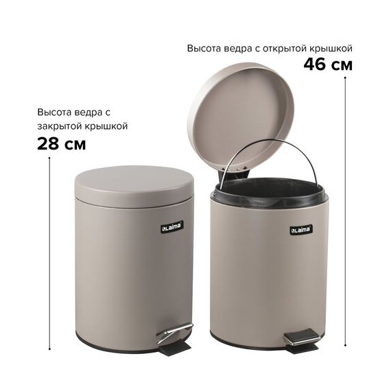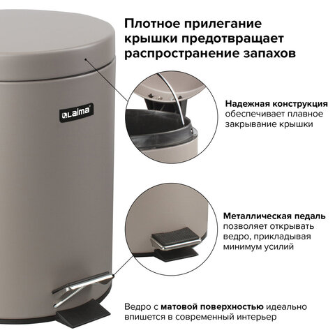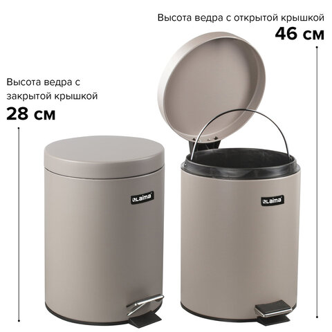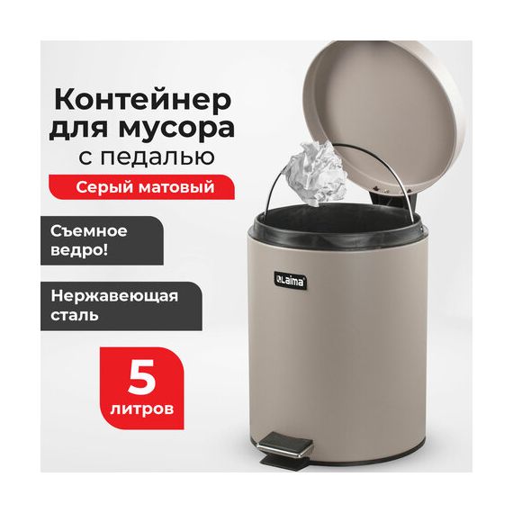 Ведро мусорное с педалью 5 литров "Classic", СЕРОЕ МАТОВОЕ, металлическое, со съемным внутренним ведром, LAIMA, 602489, 602849