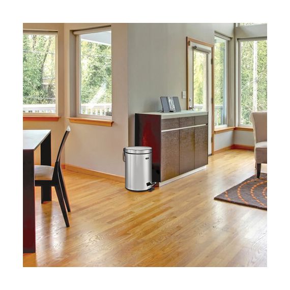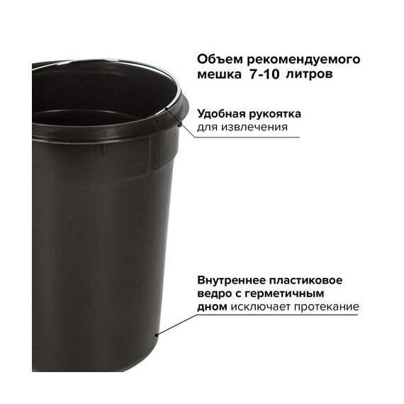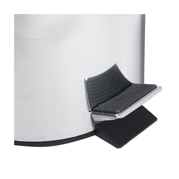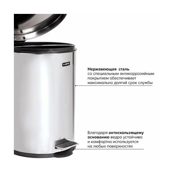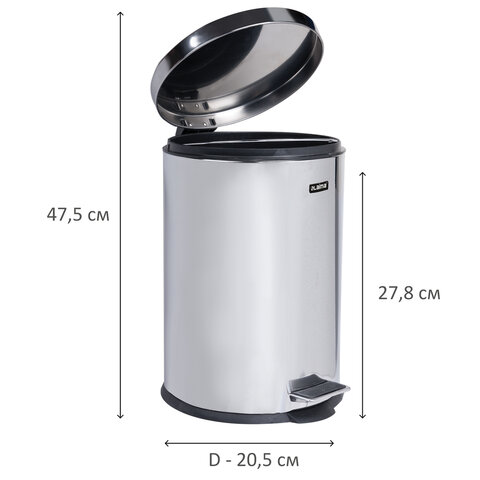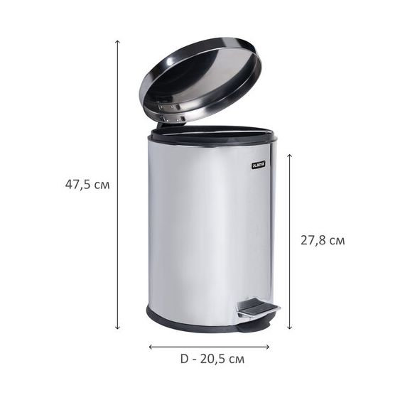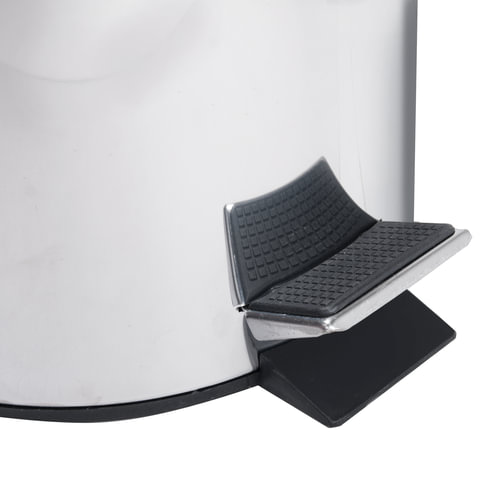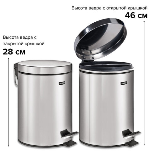5 л – подходящий объем при небольшой проходимости. Оборудовано педалью для открывания. Крышка плотно прилегает, тем самым препятствуя распространению запахов. Внутреннее съемное пластиковое ведро имеет удобную рукоятку для извлечения. Изготовлено из нержавеющей стали со специальным антикоррозийным покрытием, что обеспечивает максимально долгий срок службы. Ведро устойчиво благодаря антискользящему основанию. Объем рекомендуемого мешка – 12 л. Контейнер для мусора в стальном цвете с зеркальным покрытием имеет компактные размеры (28х20,5х20,5 см) и отлично впишется в любой интерьер.