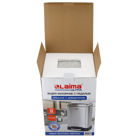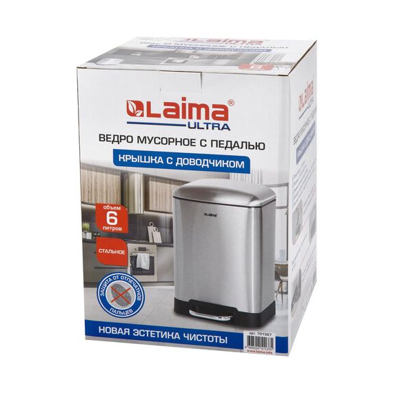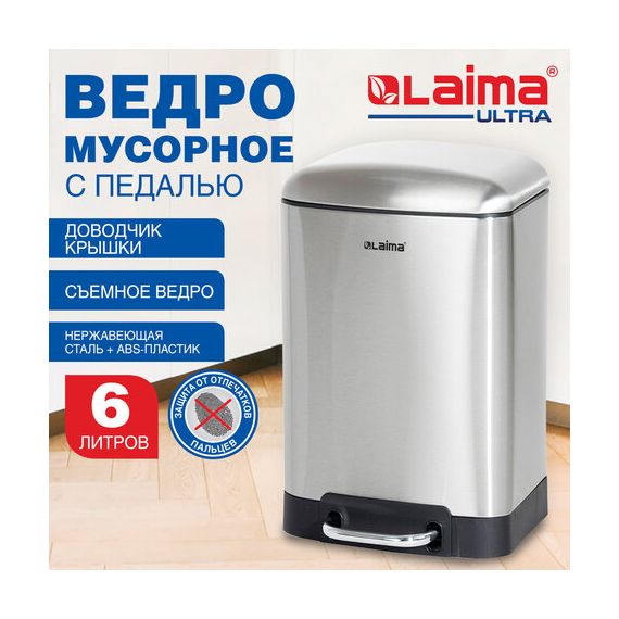 Ведро мусорное с педалью 6 л, крышка с доводчиком, стальное, БЕЗ ОТПЕЧАТКОВ, LAIMA ULTRA, 701567