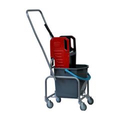 Представляет собой металлическую платформу на колесах с ведрами объемом 25 л каждое, механическим отжимом и корзинкой для бытовой химии на ручке. Корпус платформы изготовлен из хромированного металла, а инвентарь - из пластика. Тележка выполнена в трехцветном исполнении: красный, синий и серый....