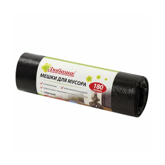 Мешки для мусора 180 л черные в рулоне 10 шт., ПВД 24 мкм, 80х106 см, ЛЮБАША эконом