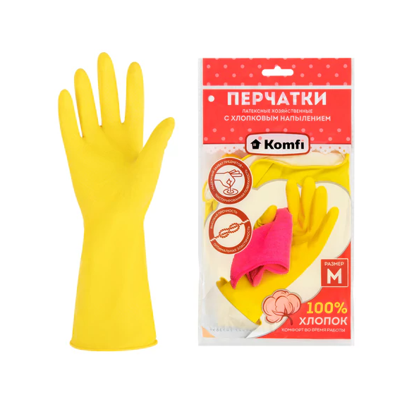 Перчатки латексные KOMFI с внутренним хлопковым напылением обеспечивают максимальный комфорт во время работы. Обеспечивают защиту рукам от мелких повреждений, грязи, красок и мыльных жидкостей