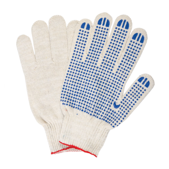 Изготовлены из хлопчатобумажной пряжи плотностью 116 текс с покрытием из поливинилхлорида с нанесением рисунка на внутреннюю сторону перчатки. Покрытие ПВХ помогает обеспечить плотный захват и предотвращает соскальзывание детали. Резинки на манжетах обеспечивают плотное прилегание перчатки к руке. Перчатки белого цвета имеют 10 класс вязки. Вес пары - 40-42 г. Поставляются в комплекте 5 штук в полиэтиленовой упаковке.