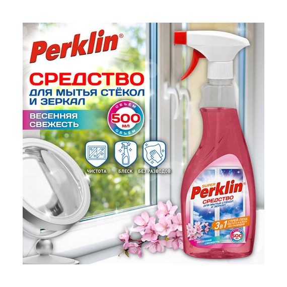 Средство для мытья стекол, зеркал, кафеля спрей/пена 500 мл, PERKLIN SUPER «Весенняя свежесть», расп