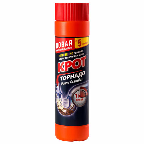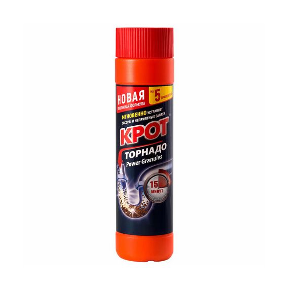 КРОТ "Торнадо" – мощное средство для растворения загрязнений в канализационных трубах. Быстро устраняет засоры в раковинах и унитазах!
