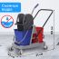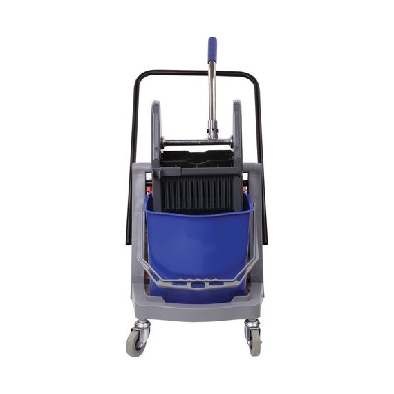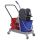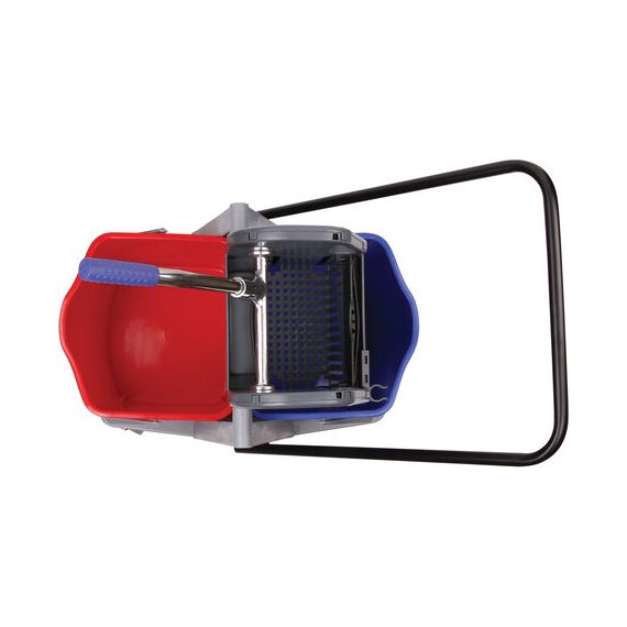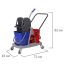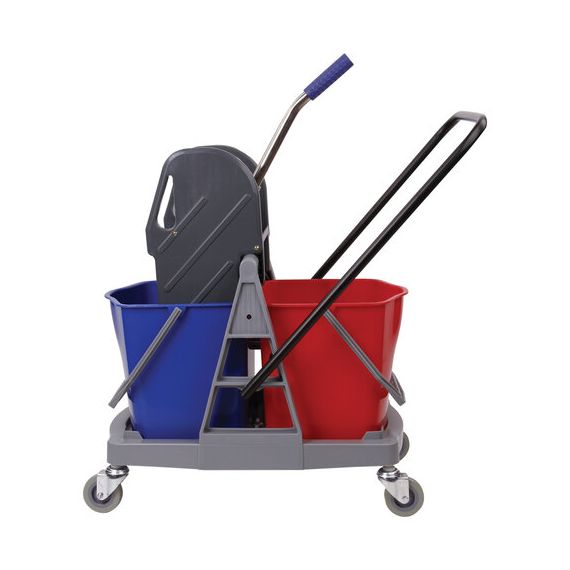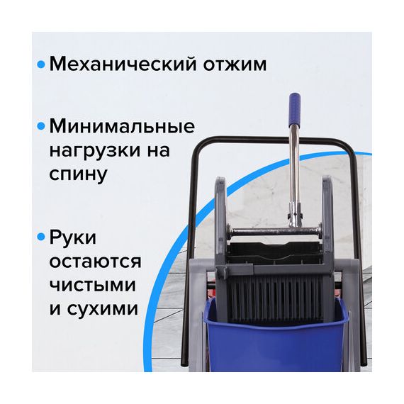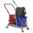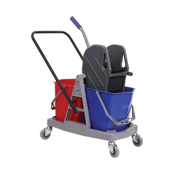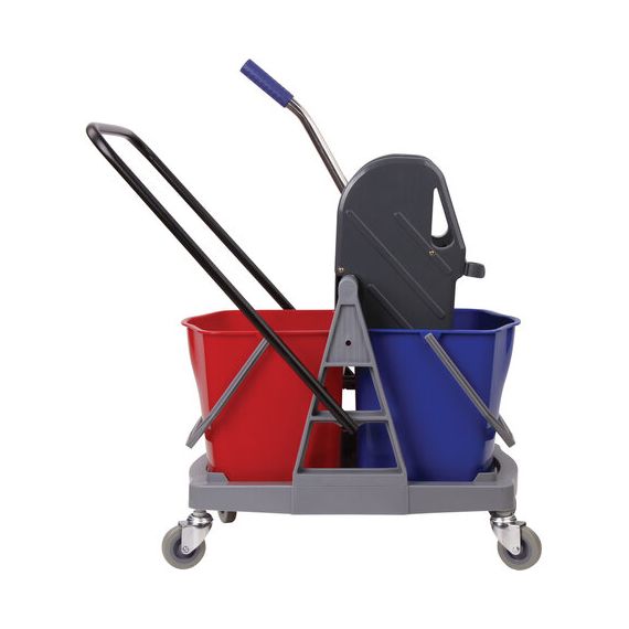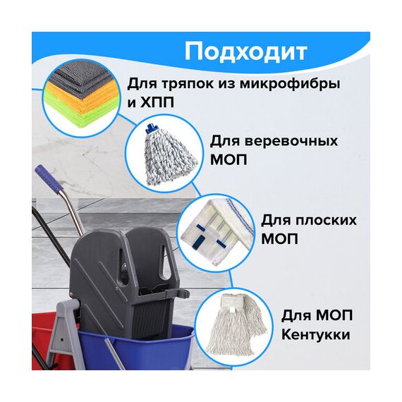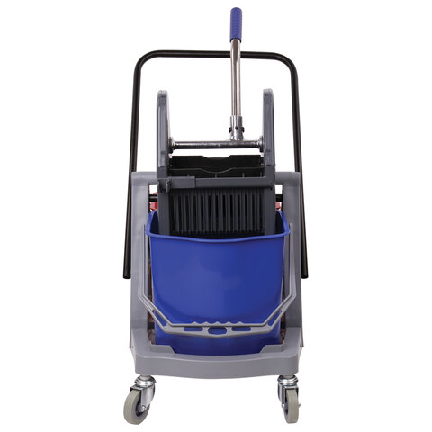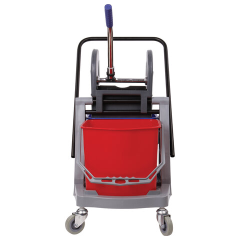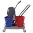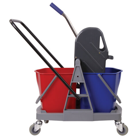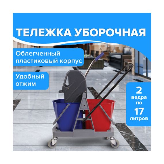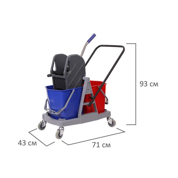 Представляет собой пластиковый каркас с установленными на него механическим отжимом для петельных тряпок и МОПов и 2 съемными ведрами по 17 л (рекомендованный объем каждого ведра - 15 л). База и инвентарь изготовлена из качественного пластика. Тележка выполнена в трехцветном исполнении: красный, синий и серый. Колеса позволяют перемещаться в произвольном направлении. Габариты - 93х43х71 см. Вес - 8 кг. Комплектация: отжим, 2 лотка, транспортная ручка, каркас.