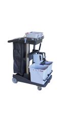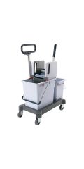Представляет собой пластиковый каркас с установленными на него механическим отжимом для петельных тряпок и МОПов и 2 съемными ведрами по 23 л (рекомендованный объем каждого ведра - 20 л). База и инвентарь изготовлена из качественного пластика. Тележка выполнена в трехцветном исполнении: красный, синий и серый. Колеса позволяют перемещаться в произвольном направлении. Габариты - 92х44х85 см. Вес - 8 кг. Комплектация: отжим, 2 лотка, транспортная ручка, каркас.