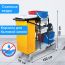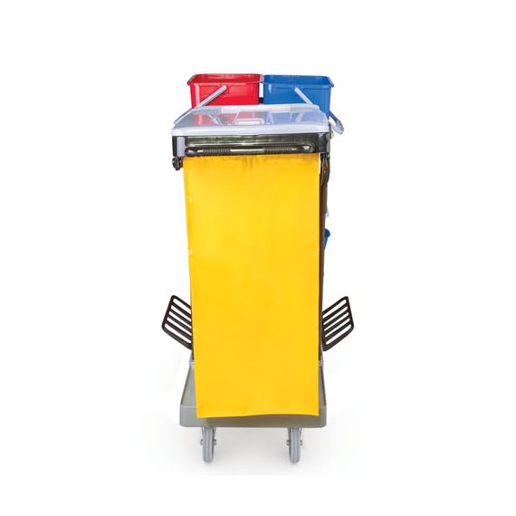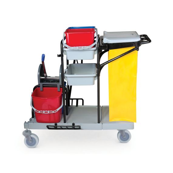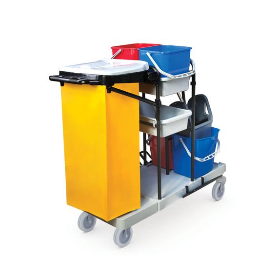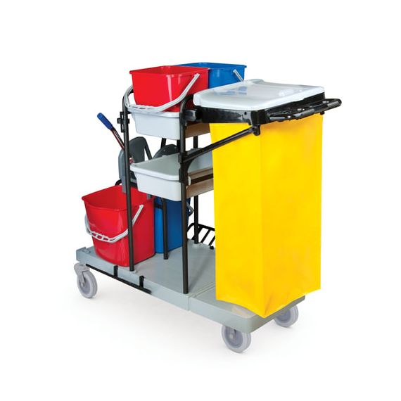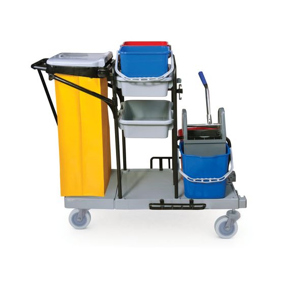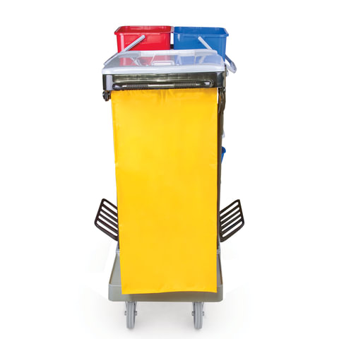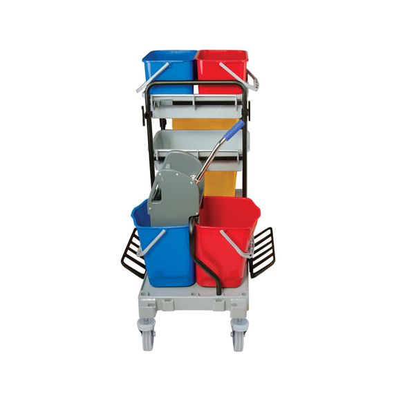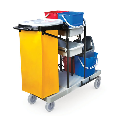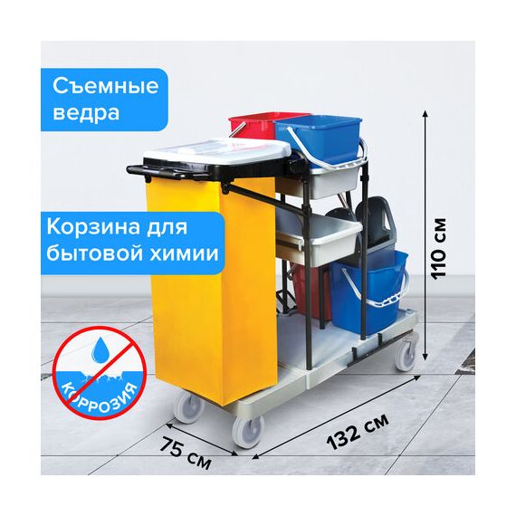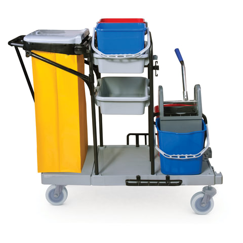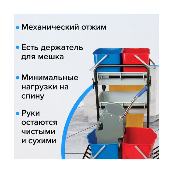 Представляет собой металлический каркас с установленными на него механическим отжимом для петельных тряпок и МОПов и 4 съемными ведрами по 20 и 11 л. База изготовлена из качественного пластика и металла, а инвентарь - из пластика. Тележка выполнена в следующих цветах: желтый, красный, серый, синий. Колеса позволяют перемещаться в произвольном направлении.