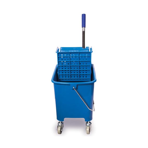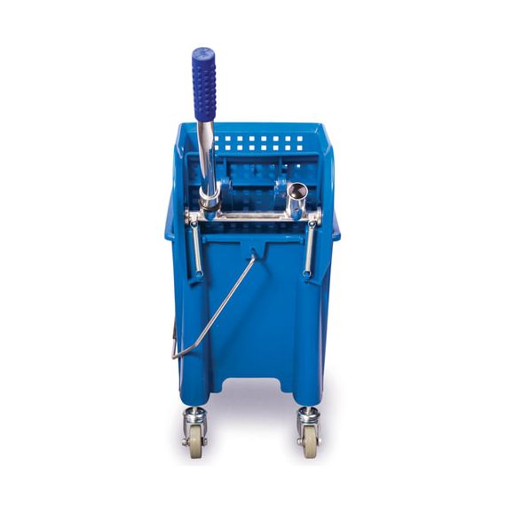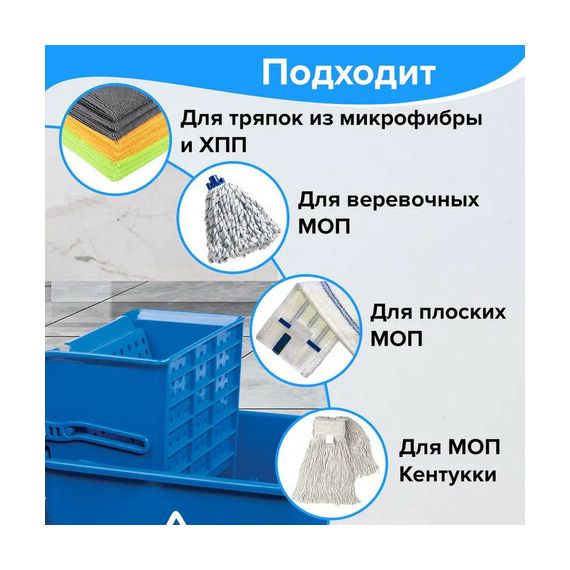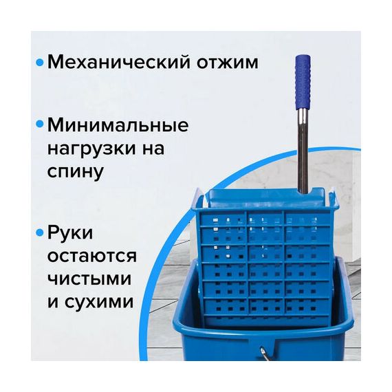 Представляет собой ведро объемом 20 л с двумя отделениями и установленным сверху механическим отжимом. Изготовлена из прочного пластика. Тележка выполнена в синем цвете. Колеса позволяют перемещаться в произвольном направлении.