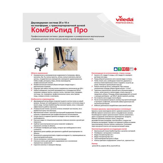 Тележка уборочная VILEDA, 2 съемных ведра 25 л+10 л, платформа, с транспортной ручкой, вертикальный отжим, 149099