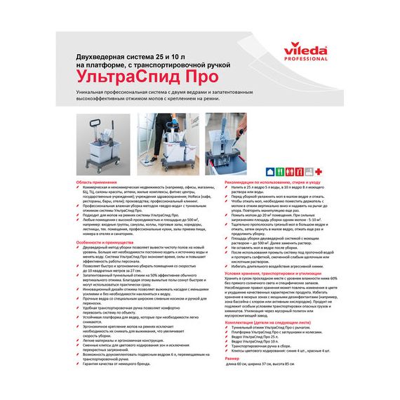 Тележка уборочная VILEDA "УльтраСпидПро", 2 съемных ведра 25 л + 10 л, платформа, с ручкой, туннельный отжим, 147209