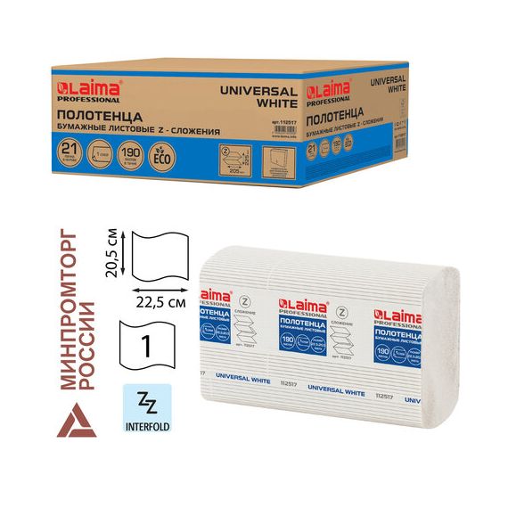 Полотенца бумажные 190 шт., LAIMA (Система H2) UNIVERSAL WHITE, 1-слойные, белые