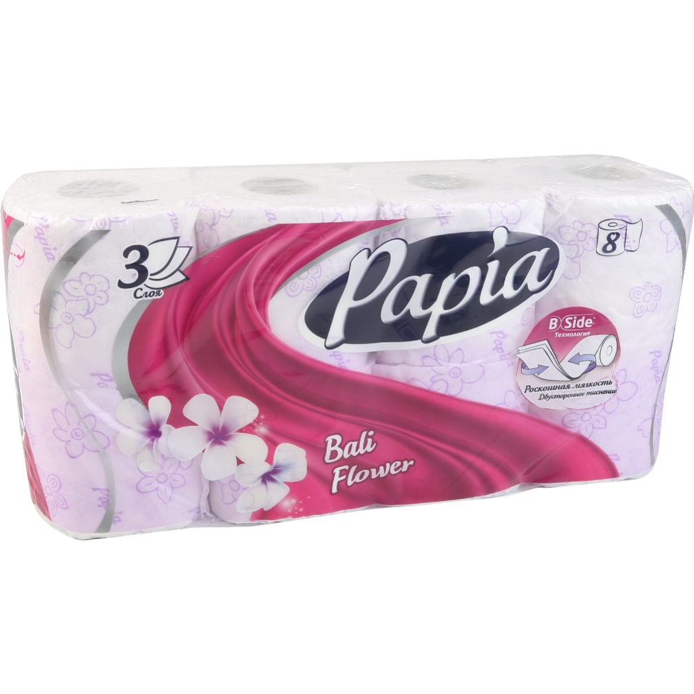 Ароматизированная трехслойная туалетная бумага Papia «Балийский цветок» с цветным тиснением и перфорацией. «Балийский цветок» – нежный цветочный аромат подарит Вам наслаждение. Уникальная технология двустороннего тиснения бумаги обеспечивает лучшую впитываемость и мягкость с обеих сторон. Теперь содержит экстракт хлопка. Туалетная бумага на 100% состоит из прочной целлюлозы высшего качества, представлена большим семейным форматом упаковки 8 рулонов.