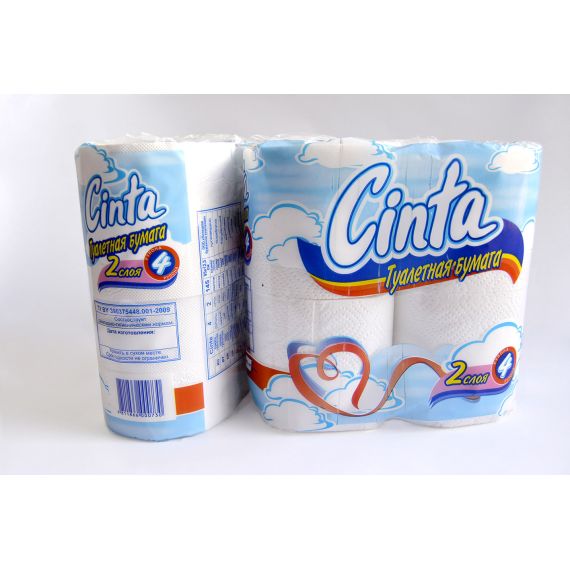 Туалетная бумага «CINTA» двухслойная из первичного целлюлозного волокна. Размер листа 125*95 мм. Количество листов в одном рулоне 145 шт. (4 рулона в упаковке)