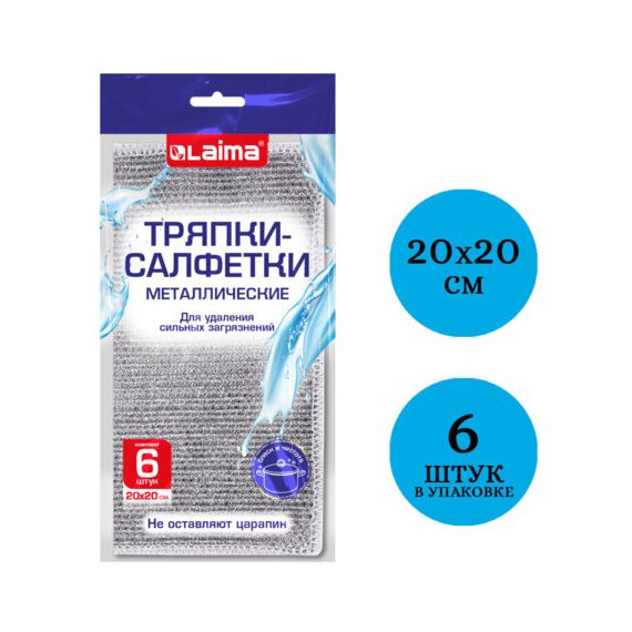 Тряпки-салфетки металлизированный эффект скрабер 20х20 см, КОМПЛЕКТ 6 штук, посуда, уборка, LAIMA