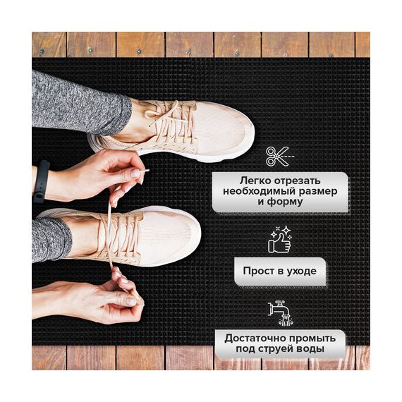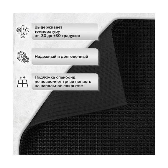Не теряет своих свойств при низких температурах, не дубеет и не скользит. Легко чистится с помощью пылесоса или встряхивания коврика. Присохшая грязь смывается струей теплой воды.