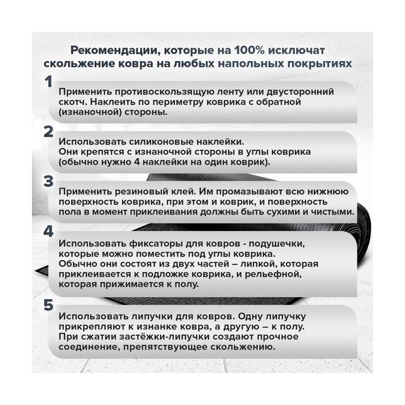 Нескользящая основа не дает влаге проникнуть на пол, предотвращает скольжение и возможные травмы при падении. Ворсовое покрытие удерживает влагу и грязь.