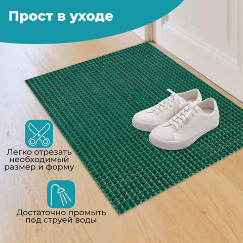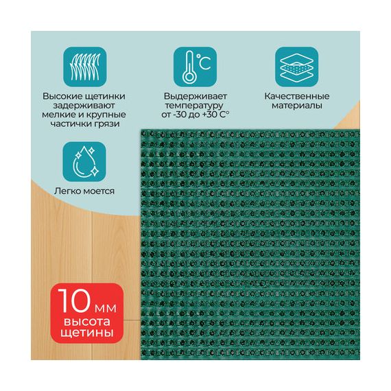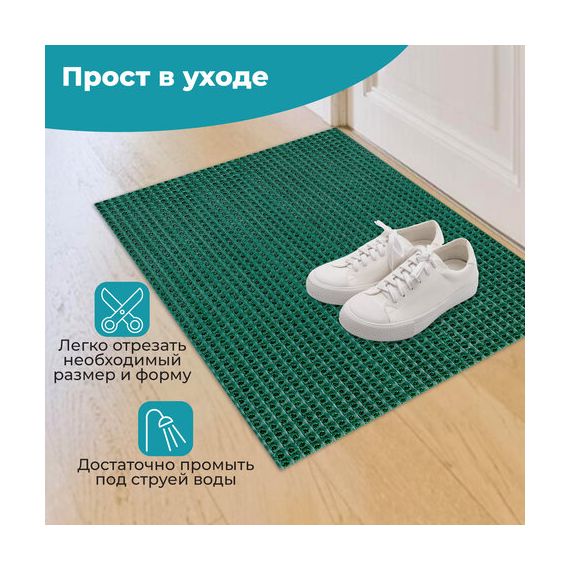 Не теряет своих свойств при низких температурах, не дубеет и не скользит. Легко чистится с помощью пылесоса или встряхивания коврика. Присохшая грязь смывается струей теплой воды.