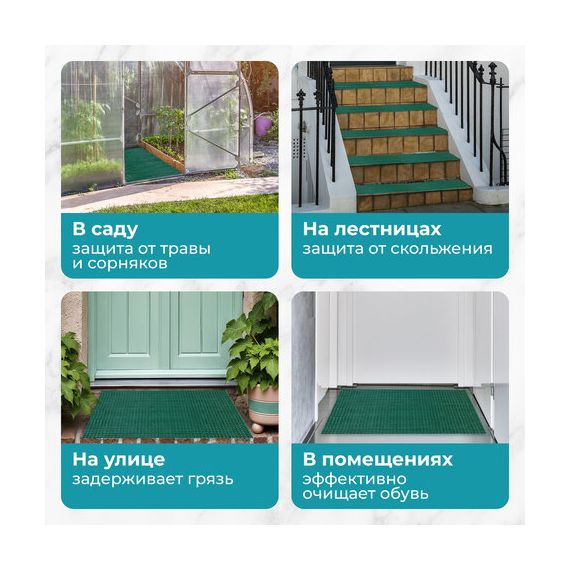 Имеет разнообразные цвета (коричневый-венге, графит, черный, зеленый), что позволяет выбрать подходящий вариант для любого интерьера или экстерьера. Коврик может использоваться в различных местах, включая частные дома, квартиры, гостиницы, офисы, супермаркеты, автомобили, спортивные площадки, бассейны и другие помещения.
