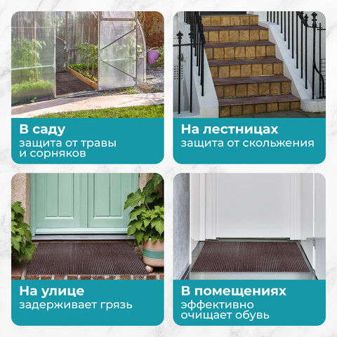 Имеет разнообразные цвета (коричневый-венге, графит, черный, зеленый), что позволяет выбрать подходящий вариант для любого интерьера или экстерьера. Коврик может использоваться в различных местах, включая частные дома, квартиры, гостиницы, офисы, супермаркеты, автомобили, спортивные площадки, бассейны и другие помещения.