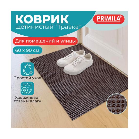 Коврик придверный PRIMILA изготовлен из прочных и долговечных износостойких материалов. Структура коврика прекрасно защищает помещение от проникновения крупных фракций песка и снега. Обеспечивает эффективное очищение подошв обуви от различных видов загрязнений. Основа из спанбонда защищает напольное покрытие под ковром от пыли, песка и грязи. Подходит для использования как внутри помещений, так и снаружи (на улице).