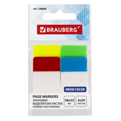 Яркие пластиковые полупрозрачные закладки BRAUBERG акцентируют внимание на важных страницах книги, журнала, каталога и др. Набор белых пластиковых закладок-выделителей размером 38х25 мм с цветными краями 4 неоновых цветов состоит из 80 листов, по 20 закладок каждого цвета. Клейкий слой - 22 Н/м. Легко клеятся к любой поверхности и не оставляют следов. Материал закладок позволяет делать надписи ручкой и карандашом. Поставляются в полиэтиленовом пакете с европодвесом.