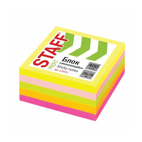 Блок самоклеящийся (стикеры) STAFF НЕОНОВЫЙ, 76х76 мм, 400 листов, 5 цветов
