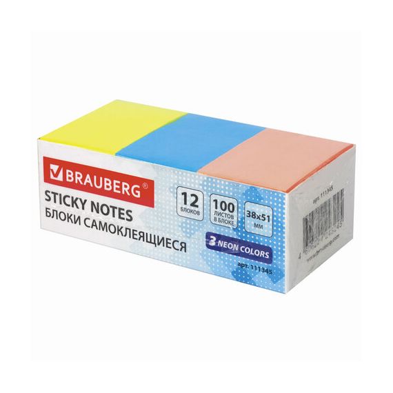 Блоки самоклеящиеся (стикеры) BRAUBERG 38х51 мм, 100 листов, НАБОР 12 штук, 3 неоновых цвета