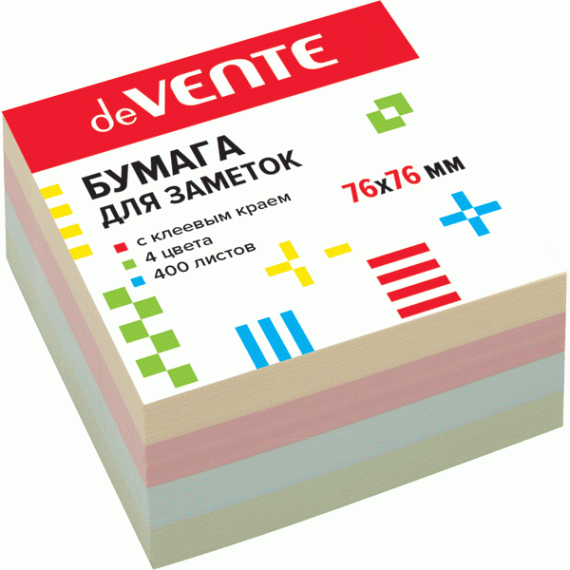 Клейкая бумага для заметок "deVENTE" 76x76 мм, 400 листов, офсет 75 г/м², 4 пастельных цвета