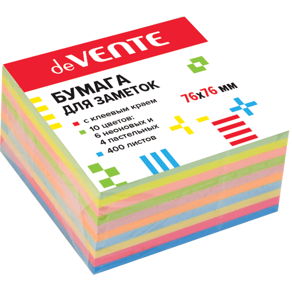 Клейкая бумага для заметок "deVENTE" 76x76 мм, 400 листов, офсет 75 г/м², 6 неоновых и 4 пастельных цветов