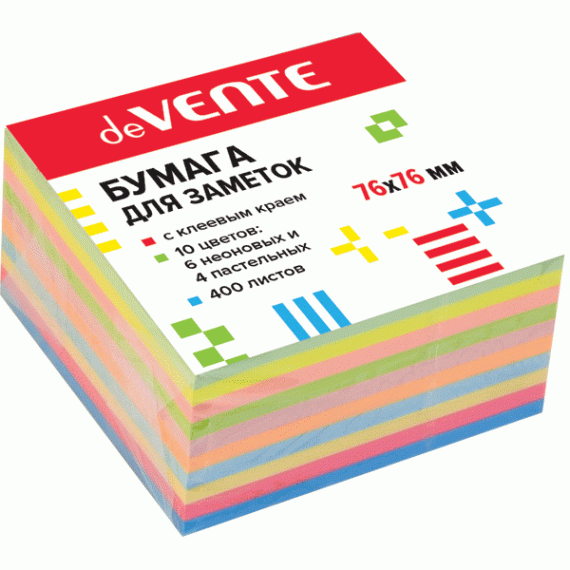 Клейкая бумага для заметок "deVENTE" 76x76 мм, 400 листов, офсет 75 г/м², 6 неоновых и 4 пастельных