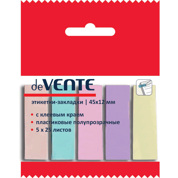Набор самоклеящихся этикеток-закладок "deVENTE. Pastel" пластиковые полупрозрачные 45x12 мм, 5x25 листов, 5 пастельных цветов, в пластиковом пакете с европодвесом