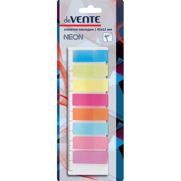Набор самоклеящихся этикеток-закладок "deVENTE" пластиковые полупрозрачные 45x12 мм, 8x25 листов, 8 неоновых цветов, в картонном блистере