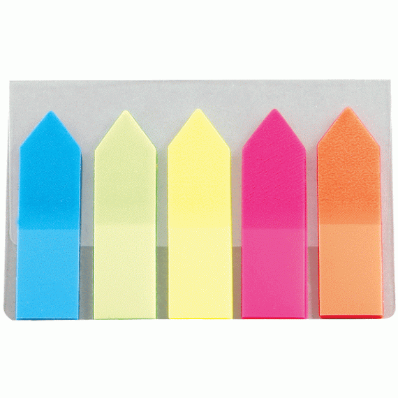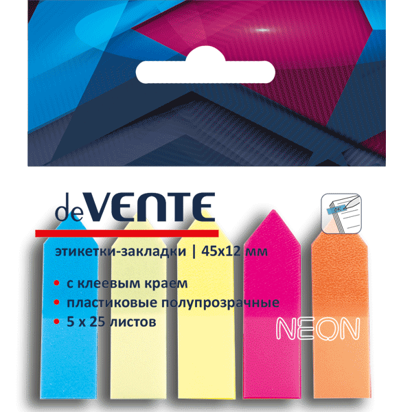 Набор самоклеящихся этикеток-закладок "deVENTE" пластиковые полупрозрачные в форме стрелки 45x12 мм, 5x25 листов, 5 неоновых цветов, в пластиковом пакете с европодвесом