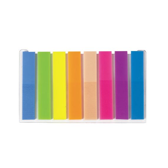 Набор пластиковых закладок 8 неоновых цветов размером 45х8 мм состоит из 160 листов, по 20 закладок каждого цвета. Клейкий слой - 22 Н/м. Легко клеятся к любой поверхности и не оставляют следов. Материал закладок позволяет делать надписи ручкой и карандашом. Уложены на пластиковом основании. Поставляются в полиэтиленовом пакете с европодвесом.