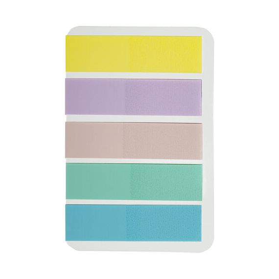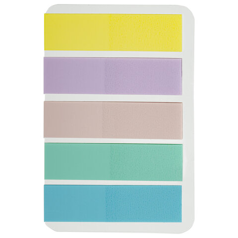 Набор пластиковых закладок 5 пастельных цветов размером 45х12 мм состоит из 100 листов, по 20 закладок каждого цвета. Клейкий слой - 22 Н/м. Закладки легко клеятся к любой поверхности и не оставляют следов. Материал закладок позволяет делать надписи ручкой и карандашом.