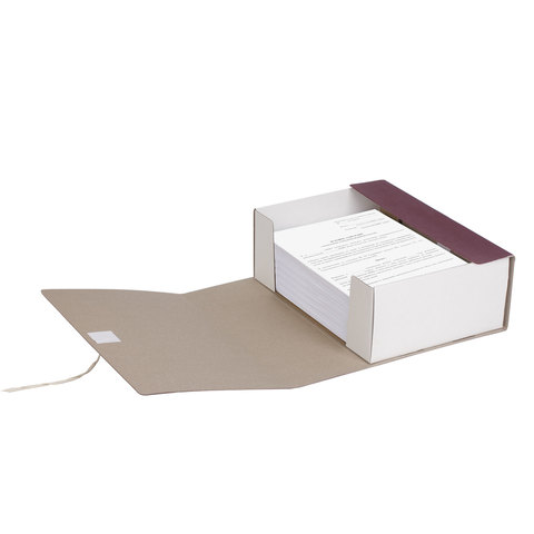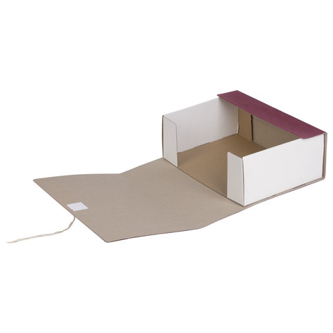 Изготовлен из переплетного картона толщиной 1,5 мм с покрытием бумвинил. Вмещает до 1000 листов. Выдерживает до 5,2 кг. Размер короба - 33x12x24 см. Имеет откидную крышку и 2 хлопчатобумажные завязки. Поставляется в разобранном виде.