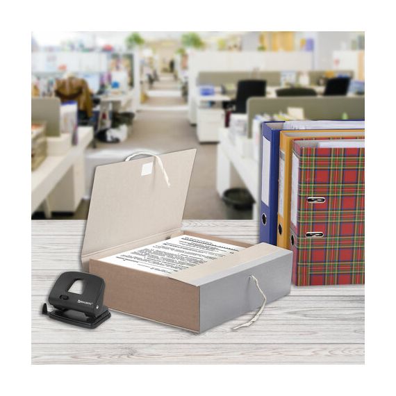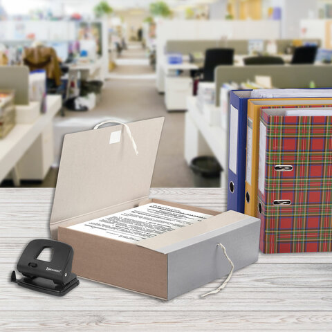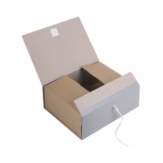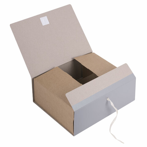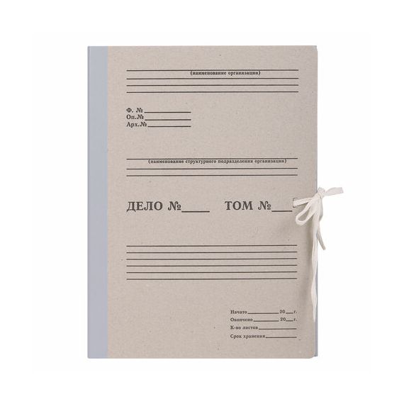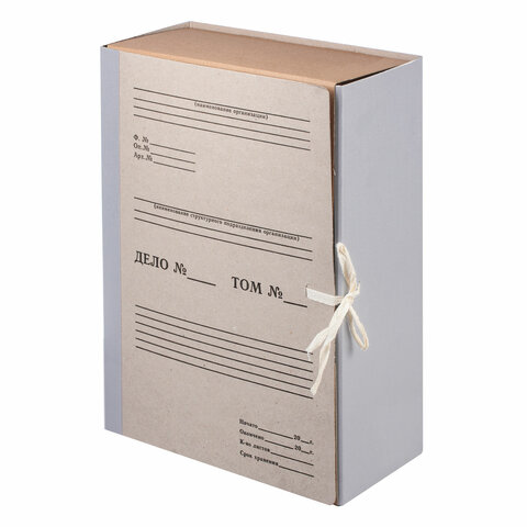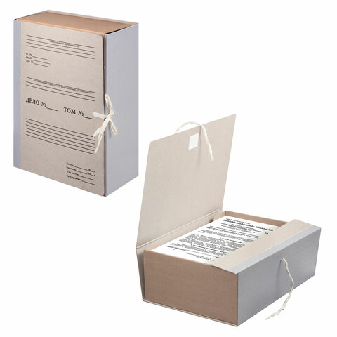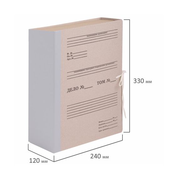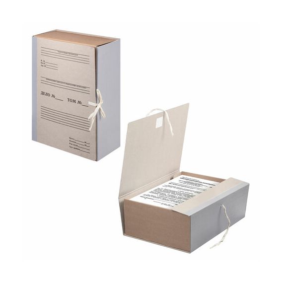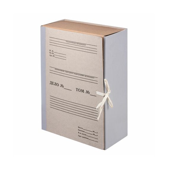 Изготовлен из переплетного картона толщиной 1,5 мм с покрытием бумвинил. Имеет поля для записей на лицевой стороне. Вмещает до 1000 листов. Выдерживает до 5,2 кг. Размер короба - 33x12x24 см. Имеет откидную крышку и 2 хлопчатобумажные завязки. Поставляется в разобранном виде.