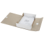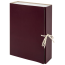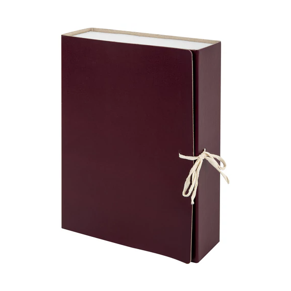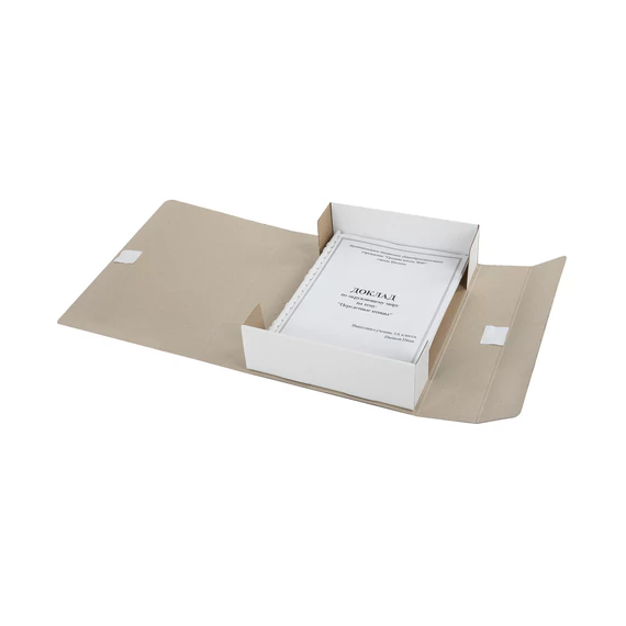 Изготовлен из переплетного картона толщиной 1,5 мм с покрытием бумвинил. Вмещает до 700 листов. Выдерживает до 4 кг. Размер короба - 33x8x24 см. Имеет откидную крышку и 2 хлопчатобумажные завязки. Поставляется в разобранном виде.