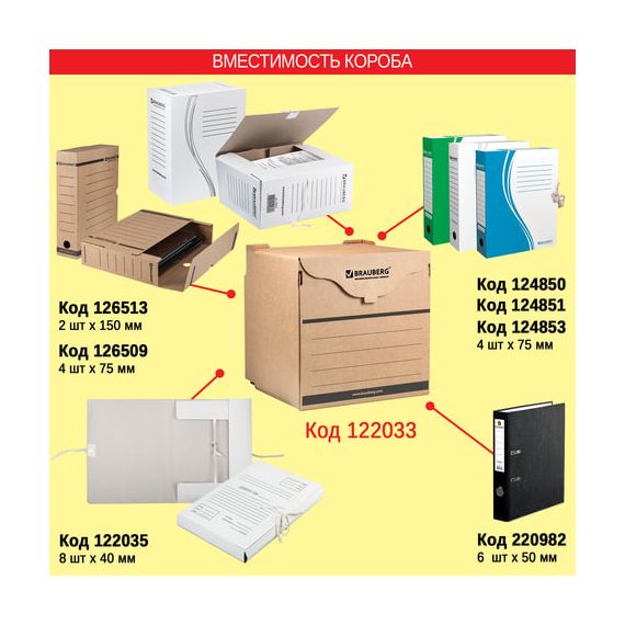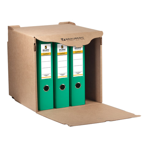 Изготовлен из гофрокартона марки Т-24, профиль «В». Толщина картона - 3 мм. Вмещает 4 накопителя документов с толщиной корешка 75 мм. Выдерживает до 40 кг. Размер короба - 34x31x33 см. Имеет откидную крышку. Поставляется в разобранном виде.