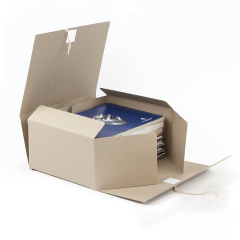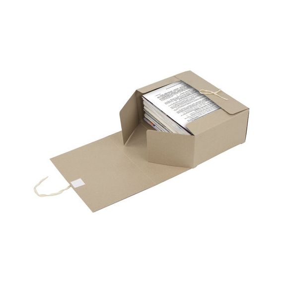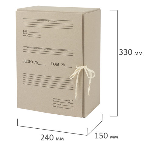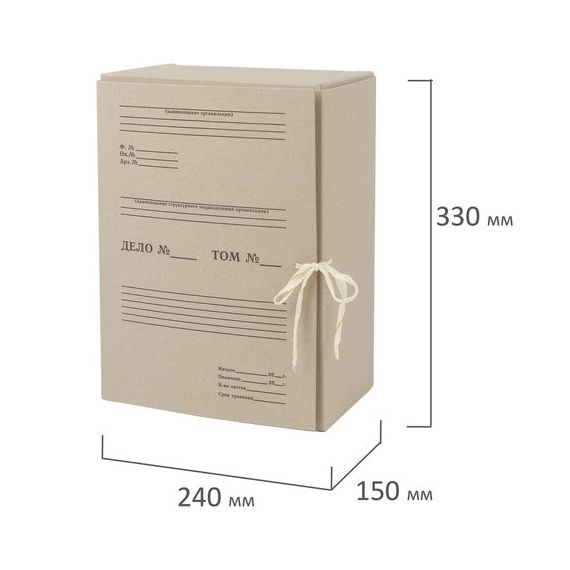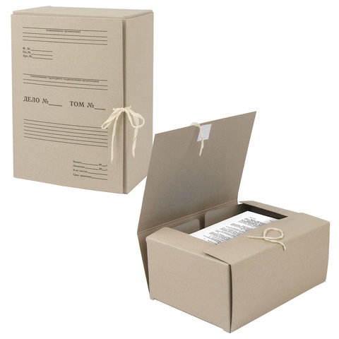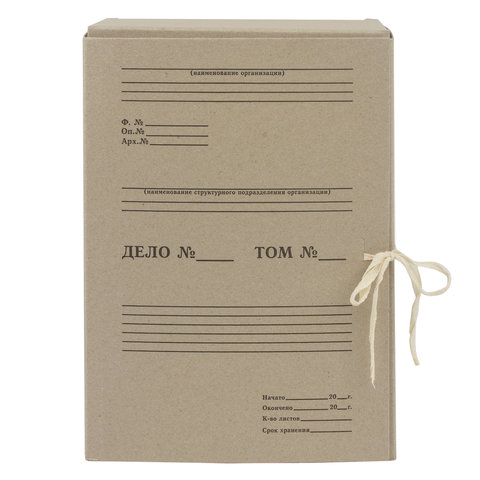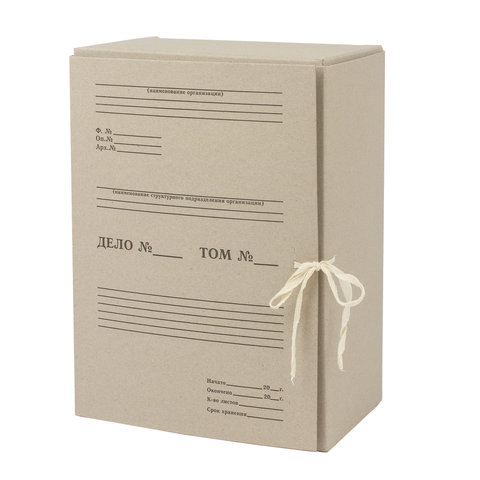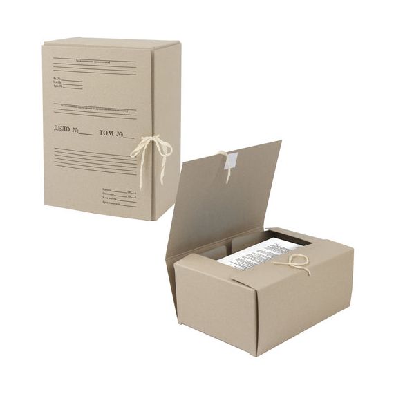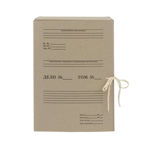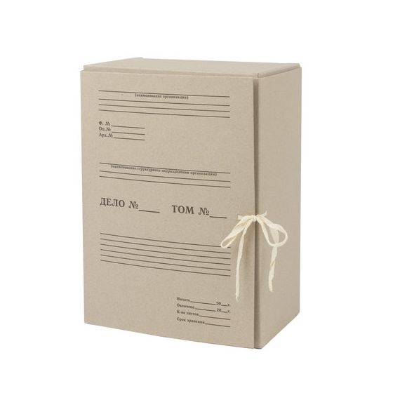 Изготовлен из переплетного картона толщиной 1,25 мм. Имеет поля для записей на лицевой стороне. Вмещает до 1400 листов. Выдерживает до 7 кг. Размер короба - 33x15x24 см. Имеет откидную крышку и 2 хлопчатобумажные завязки. Поставляется в разобранном виде.
