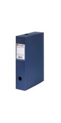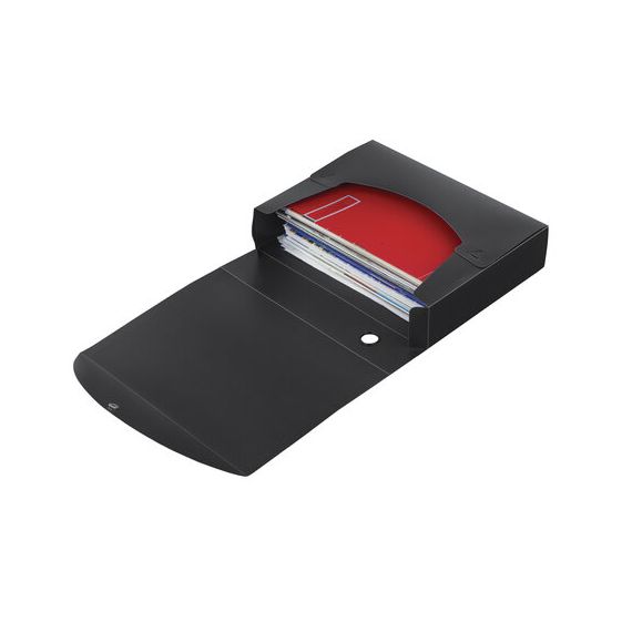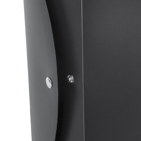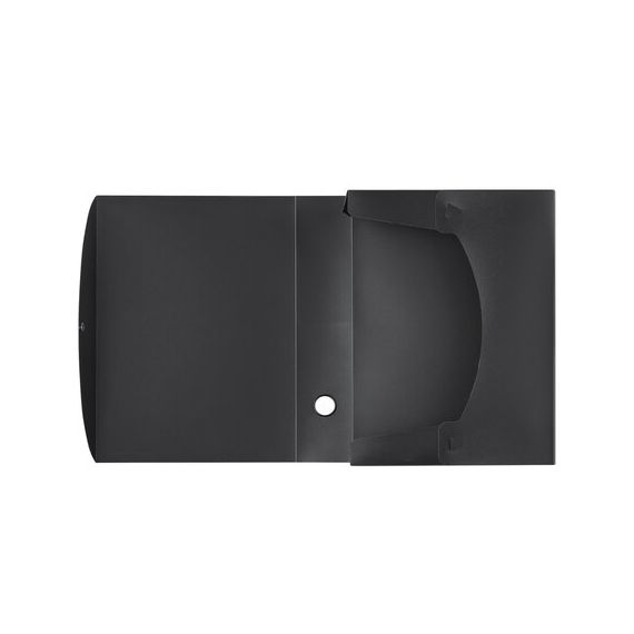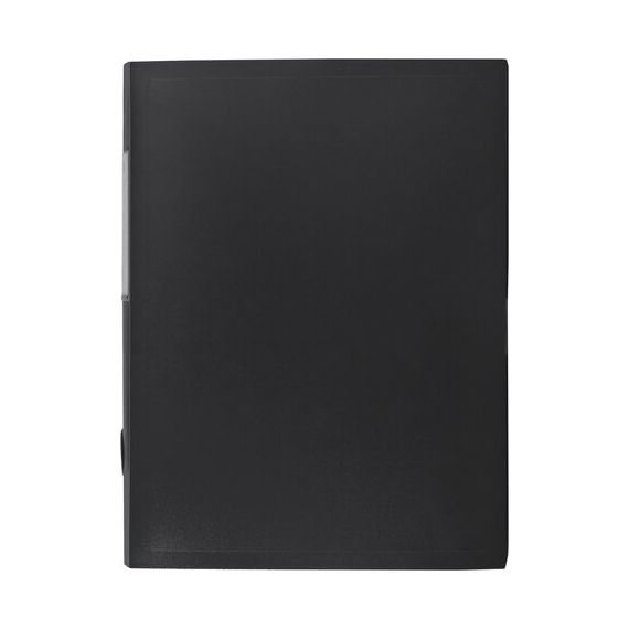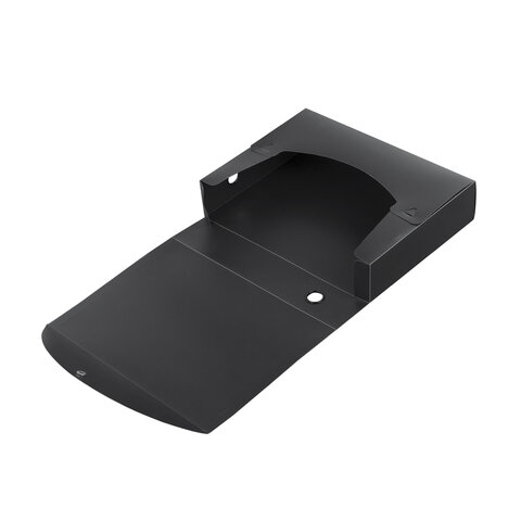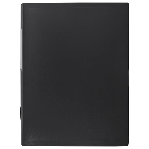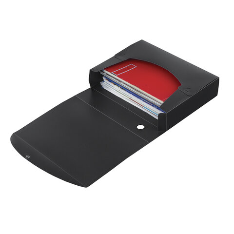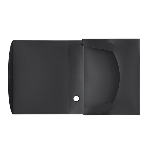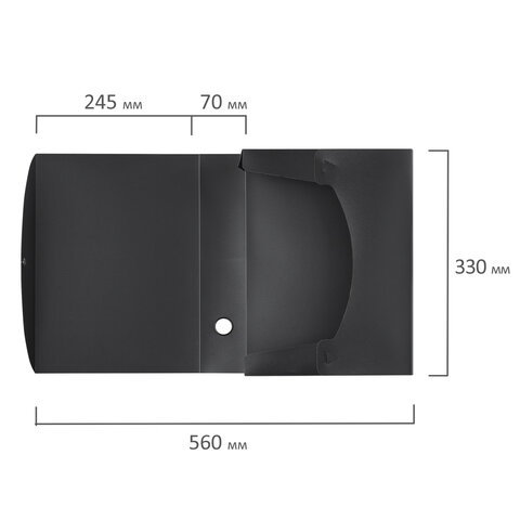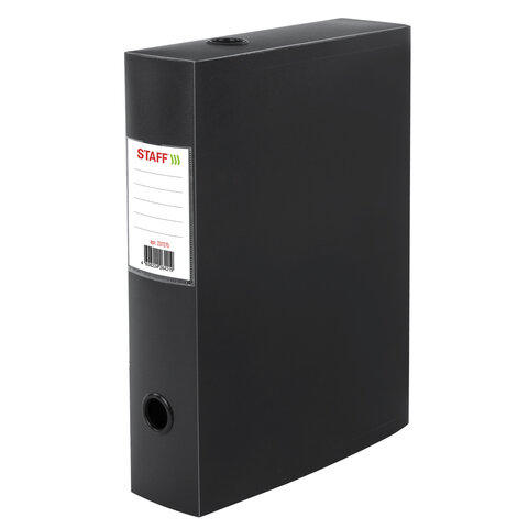 Вмещает до 750 листов формата А4. Изготовлен из прочного пластика черного цвета толщиной 0.7 мм. В закрытом виде фиксируется с помощью металлической кнопки. Размер - 330х245х70 мм. Сменная этикетка в кармане на корешке.