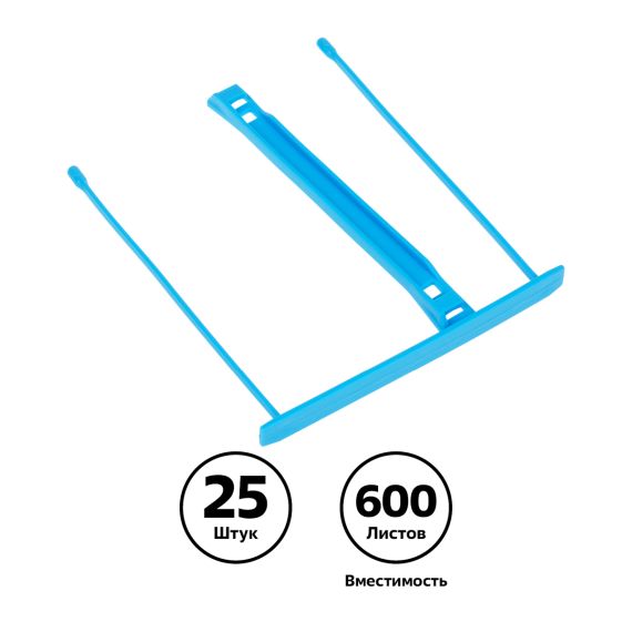 В наборе – 25 штук скоросшивателей. Упаковка – картонная коробка с изображением пошаговой инструкции по применению изделий. Цвет механизмов – синий.