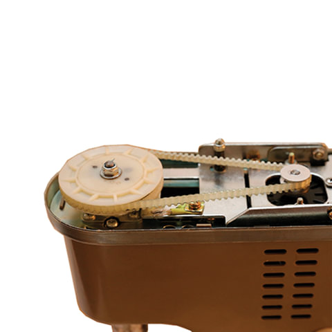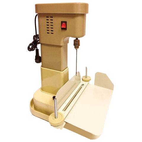 Принцип работы: перьевое сверло проделывает отверстие в пачке бумаги, затем станок останавливает сверление и накидывает нить в паз сверла, после чего нить протягивается сквозь весь бумажный блок. Таким образом осуществляется прошивка на произвольное количество отверстий, далее концы нити из крайних отверстий связываются узлом.